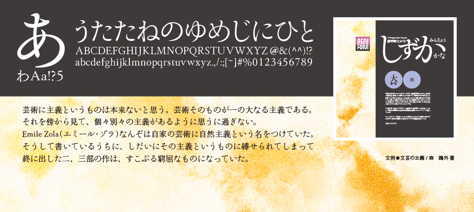 また、「勢蓮明朝」ファミリー・「勢蓮呉竹」ファミリーは、文字がもつ本来の美しさを極限まで追求した傑作。「靜呉竹」ファミリーは、「読むことに専念してもらうために」をコンセプトにした、おとなしく、ほんわかあたたかい仮名書体です。「清明かな」ファミリーは、伸びやかな切れ味の中に優しさ・優美さを包含した不思議なかな書体です。