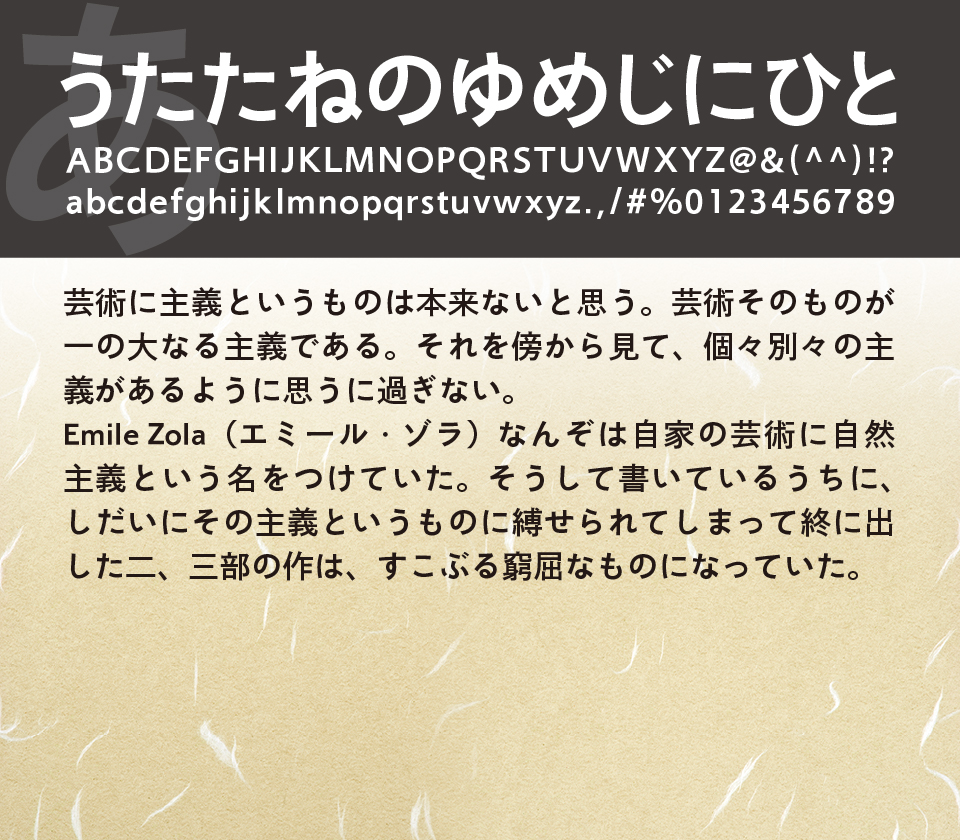 なかでも「和音」ファミリーは、漢字、平仮名、片仮名、欧文、記号類、用途字種、数字の各字種に音楽的特徴をもたせ、それぞれがもつ特徴が見事に調和する「和音=ハーモニー」の名にふさわしい出来。POPから本文組まで幅広く使用できる完成度の高い書体が特長です。