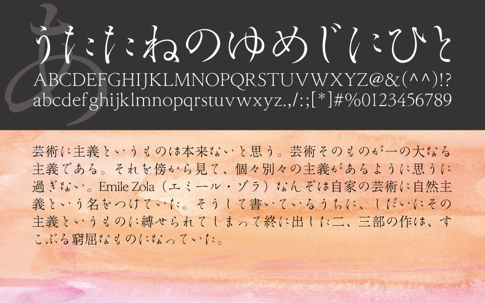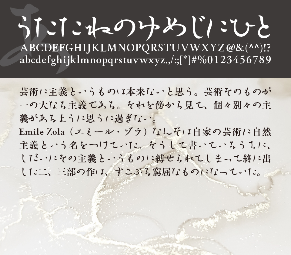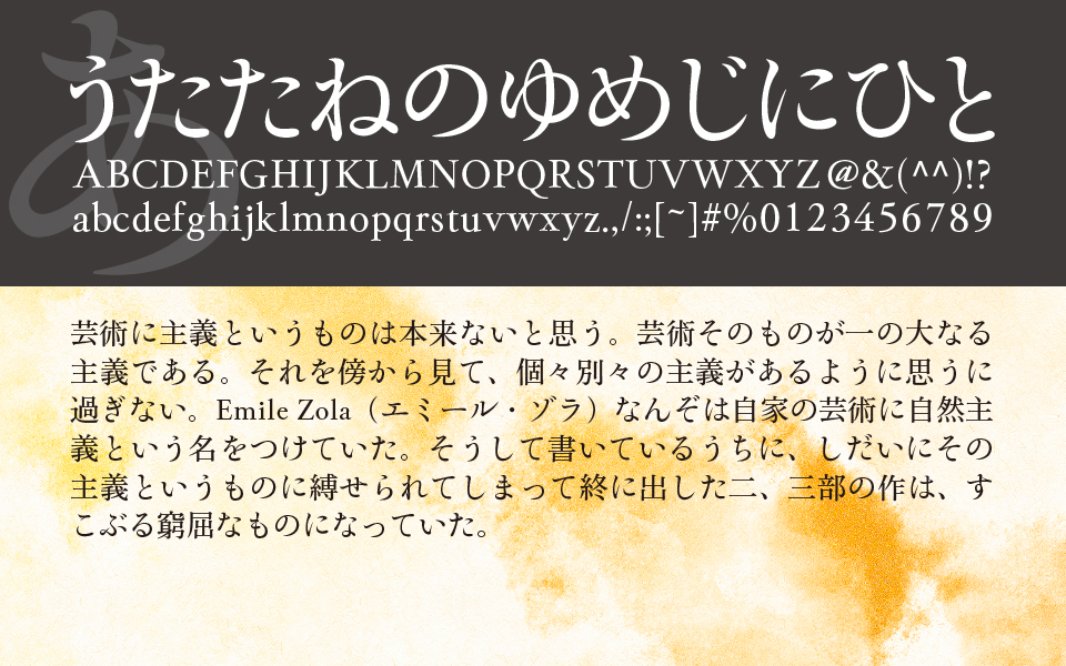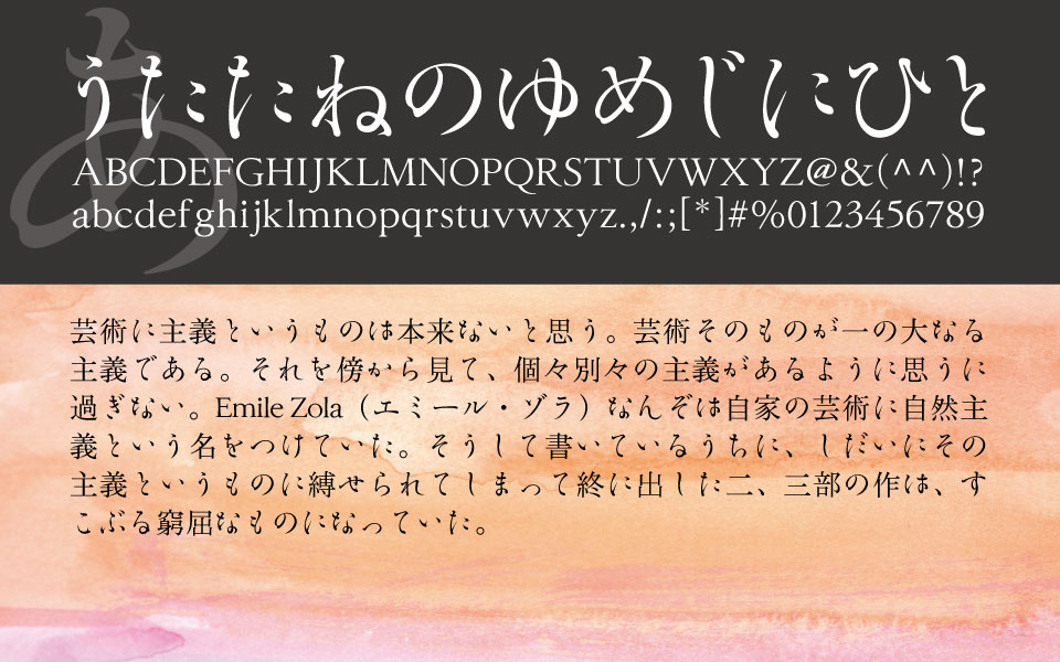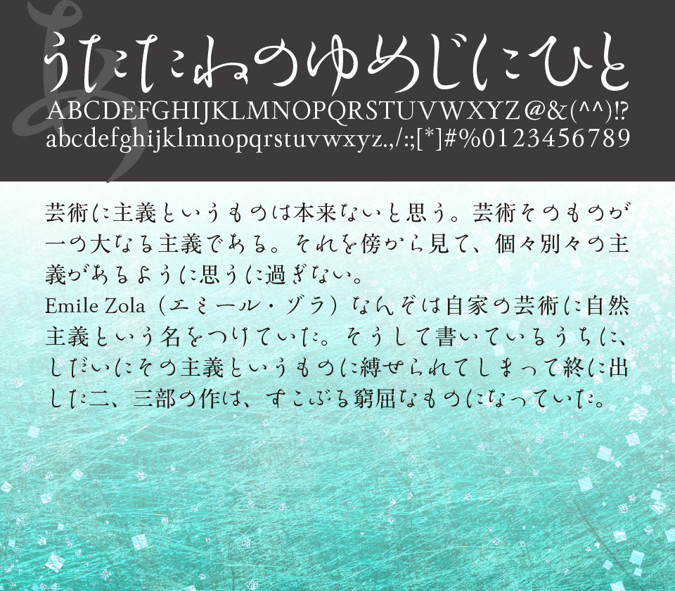 清明かなOTF = FOT 筑紫明朝Pro LB / フォントワークス株式会社, A-OTF リュウミンPro M-KL / 株式会社モリサワ, DNP 秀英明朝Pr6N B / 大日本印刷株式会社