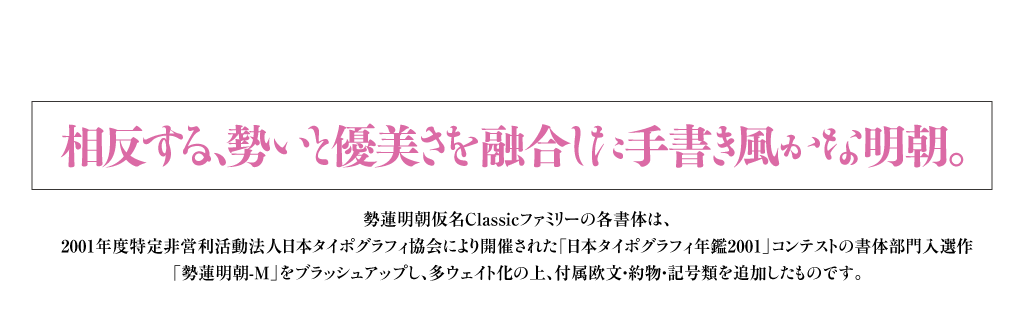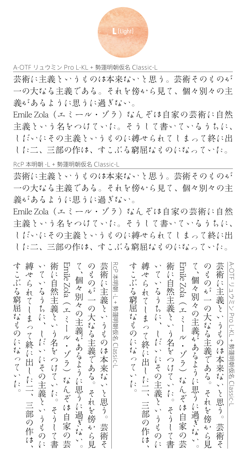 この書体は、すべてのフォントフォーマットにおいて、Adobe-Japan1-0 に準拠し制作されています。含まれる文字種は以下の通りです。